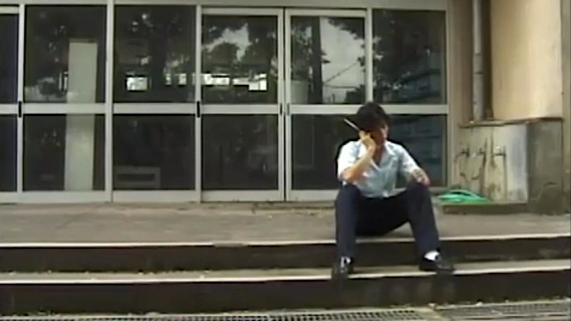 A young man on a bicycle is turning a corner in front of an apparently abandoned building when he begins to hear the ringing of a cell phone. (A prequel to the first version of Ju-on, 2000.)